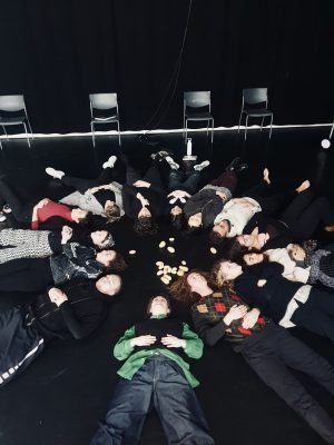 1. Similar to last week, take the opportunity to try out something new. Which I believe we did throughout the whole structure we set up. I would like to highlight our interest in performative spacing, which we took from last week’s ‘gossip round’ and wanted to take a step further. That’s why we came up with the sun, creating a spatial and a bodily condition, reminiscent of star gazing and cloud watching. I found this particularly interest as the group came out of discussing and sharing mode when we invited them to lay down together. It took a while to relax, people were active, maybe a bit nervous, but once settled in, the calmness was embodied and we could dream and phantasies a bit together about the piece. I found it super interesting to see what some moments of silence could to, shifting the body’s state, the tone of voice and thus influence how we think, how we reflect on things, what we share and how we communicate with each other. For me it felt a bit like a collective meditation about the piece/process.
